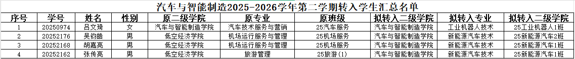 根据《徽商职业学院学生转专业与转学管理办法(修订)》(徽院教〔2024〕24号)的规定,经学生本人申请、转出二级学院审查、转入二级学院党政联席会议研究,汽车与智能制造学院拟接收以下4名学生转入新专业学习。