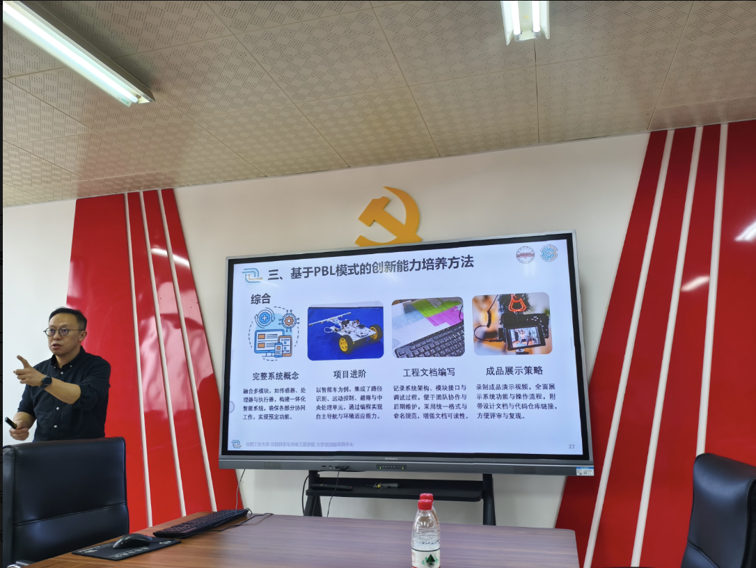 为深化教育教学改革,提升学生创新实践能力,推动专业建设与学科竞赛深度融合,4月2日下午,合肥工业大学仪器仪表与光电工程学院大学生创新实践中心主任张阳副教授应邀莅临汽车与智能制造学院,开展以“基于PBL项目式学习模式创新能力培养探究”为主题的专题讲座。汽车与智能制造学院院长褚先文,以及相关专业竞赛指导教师、参赛学生代表到场聆听学习。