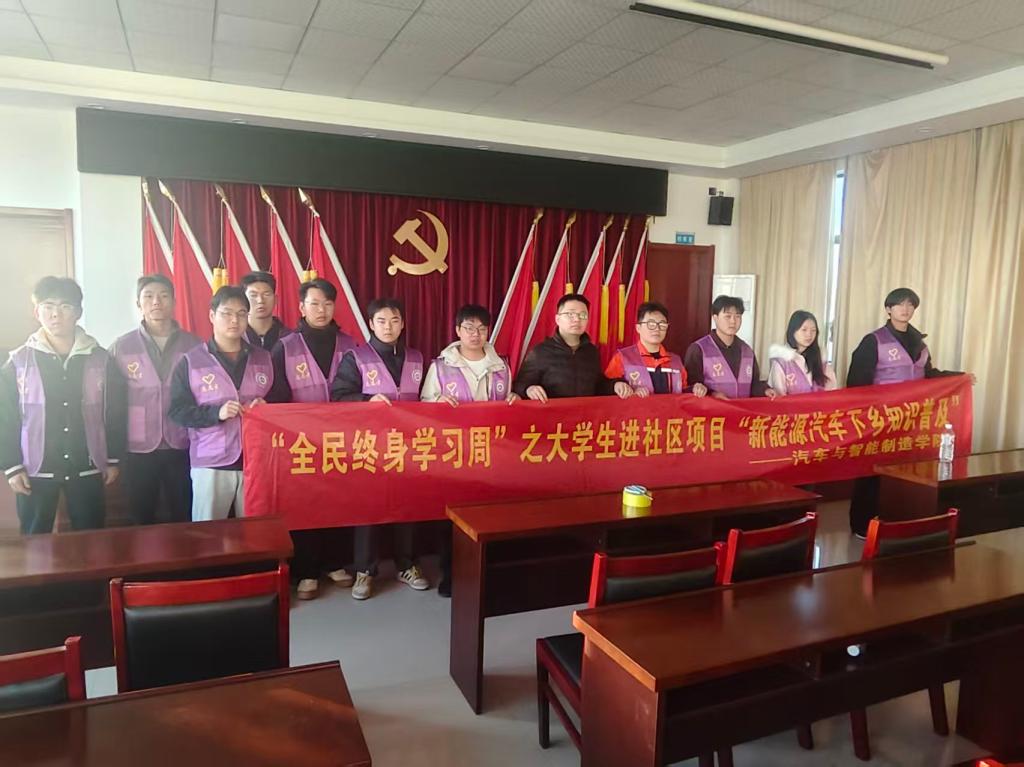 为推动新能源技术普及与乡村绿色发展深度融合,正值“全民终身学习周”热潮未尽。11月30日,汽车与智能制造学院 “智造匠星” 志愿服务队走进紫蓬镇白衣社区,以“纽扣课堂”为载体,开展了一场别开生面的新能源知识下乡普及宣传活动。