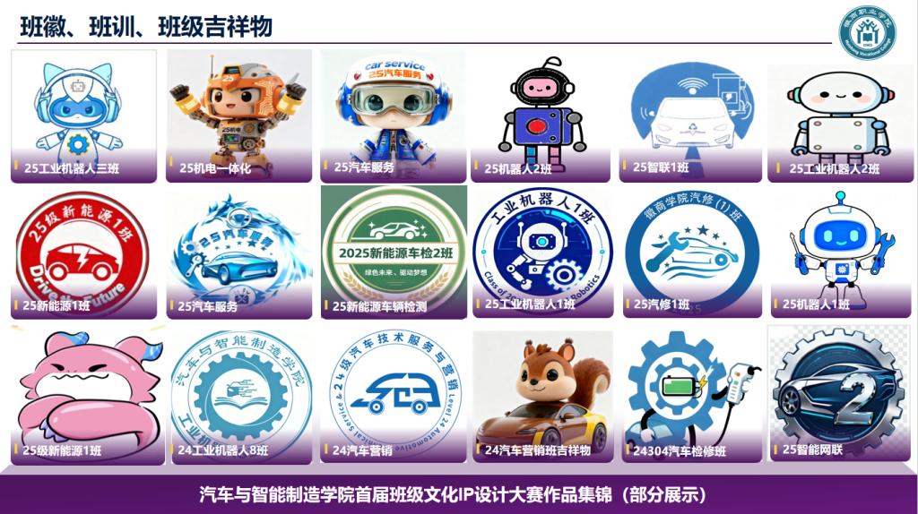 大赛自启动以来,各班级学子充分发挥创意才华:班徽设计构思精巧,或以齿轮、汽车轮廓彰显汽智学院专业属性,或以渐变色块传递青春活力;班训凝练有力,“笃行致远,智造未来”“精研技术,勇毅争先” 等字句,既体现了学子对专业学习的执着追求,也展现了班级的精神底色;班级吉祥物造型灵动,或结合专业元素设计出卡通机器人、新能源汽车形象,或融入班级特色符号,寓意鲜明、憨态可掬。投票期间,学院官微集中展示了各参赛班级的文化 IP 作品,详细解读设计理念与内涵。