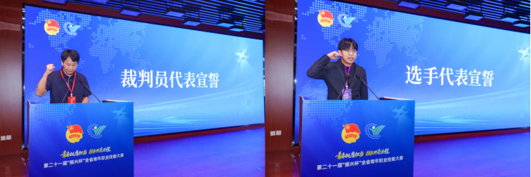 裁判员张晓春、参赛选手朱逵分别代表全体裁判专家和竞赛选手宣誓。