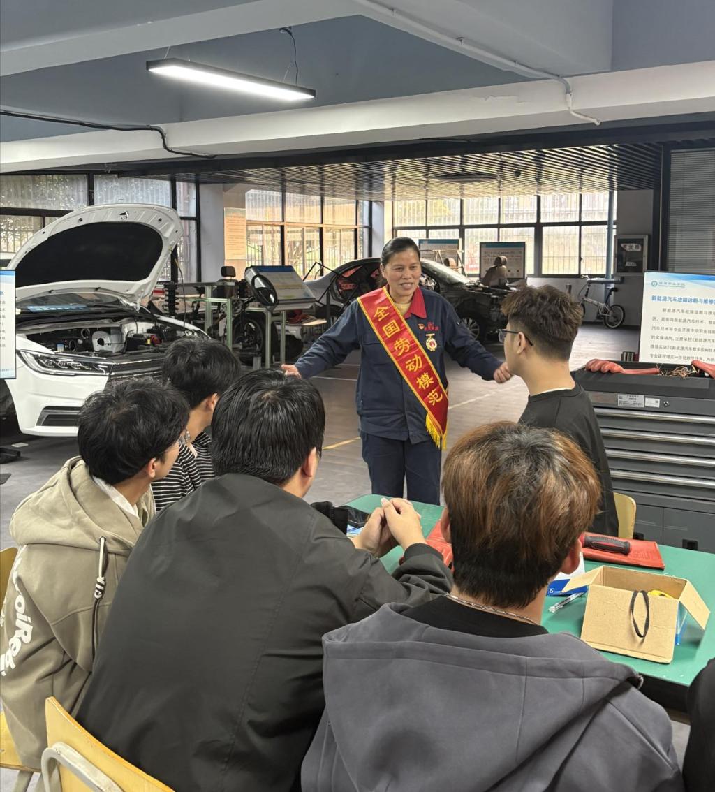 讲座结束后,李小莉走进学校汽车与智能制造学院实训车间,与学生进行互动交流。围绕汽车核心零部件研发与应用,她用通俗直白的语言拆解专业难点:详解铝合金油箱、储气筒“耐腐蚀性强、轻量化”的技术优势,对比传统铁质部件的行业局限,阐释其在重卡领域的适配逻辑;针对储气筒、驾驶室支架等结构件,聚焦“强度适配、抗震防抖、轻量化设计”等核心技术要求展开深度解析;结合近200L铁油箱、拱型梁、B型梁及支架支脚类零部件,系统讲解其在车辆承载、安全稳定中的关键作用。“零部件的精度误差每缩小1毫米,车辆安全性就提升一分,这就是工匠精神最朴素的体现。”学生们纷纷表示,劳模的奋斗故事直抵人心,专业讲解全是干货,不仅让他们明确了专业学习的重点方向,更坚定了技能成才、技能报国的信念。