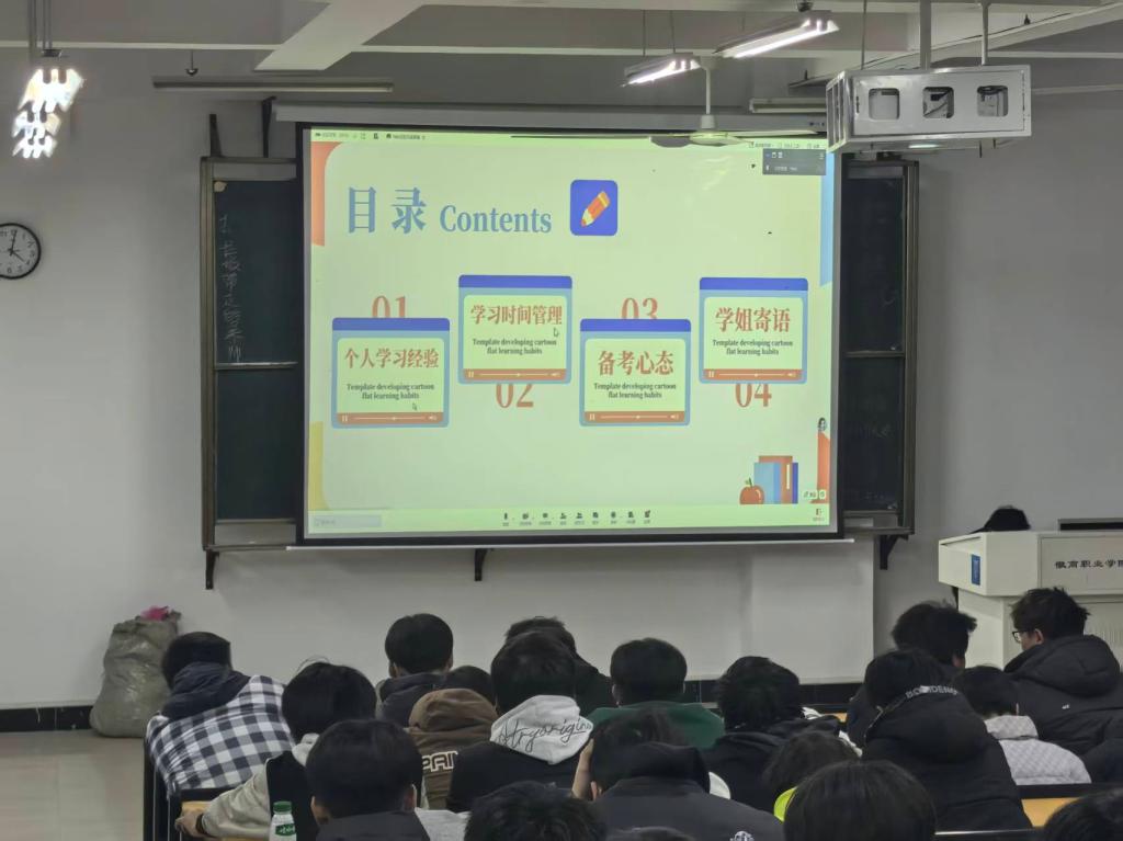 在经验分享环节,2位学长学姐结合自身备考经历与本科学习生活,从“职业规划视角下的专升本选择”切入,带来了全方位的干货分享。谢凤柯学姐详细拆解了跨专业报考的决策逻辑,强调“专升本不仅是学历提升,更是职业赛道的优化”,她结合当前行业就业趋势,建议同学们在备考时兼顾专业适配度与职业发展潜力;姚军震学长则聚焦备考时间管理,分享了“碎片化学习+阶段性复盘”的实用方法,现场展示了自己的备考日历与职业规划思维导图,让同学们直观感受到“升学与职业规划的联动性”。
