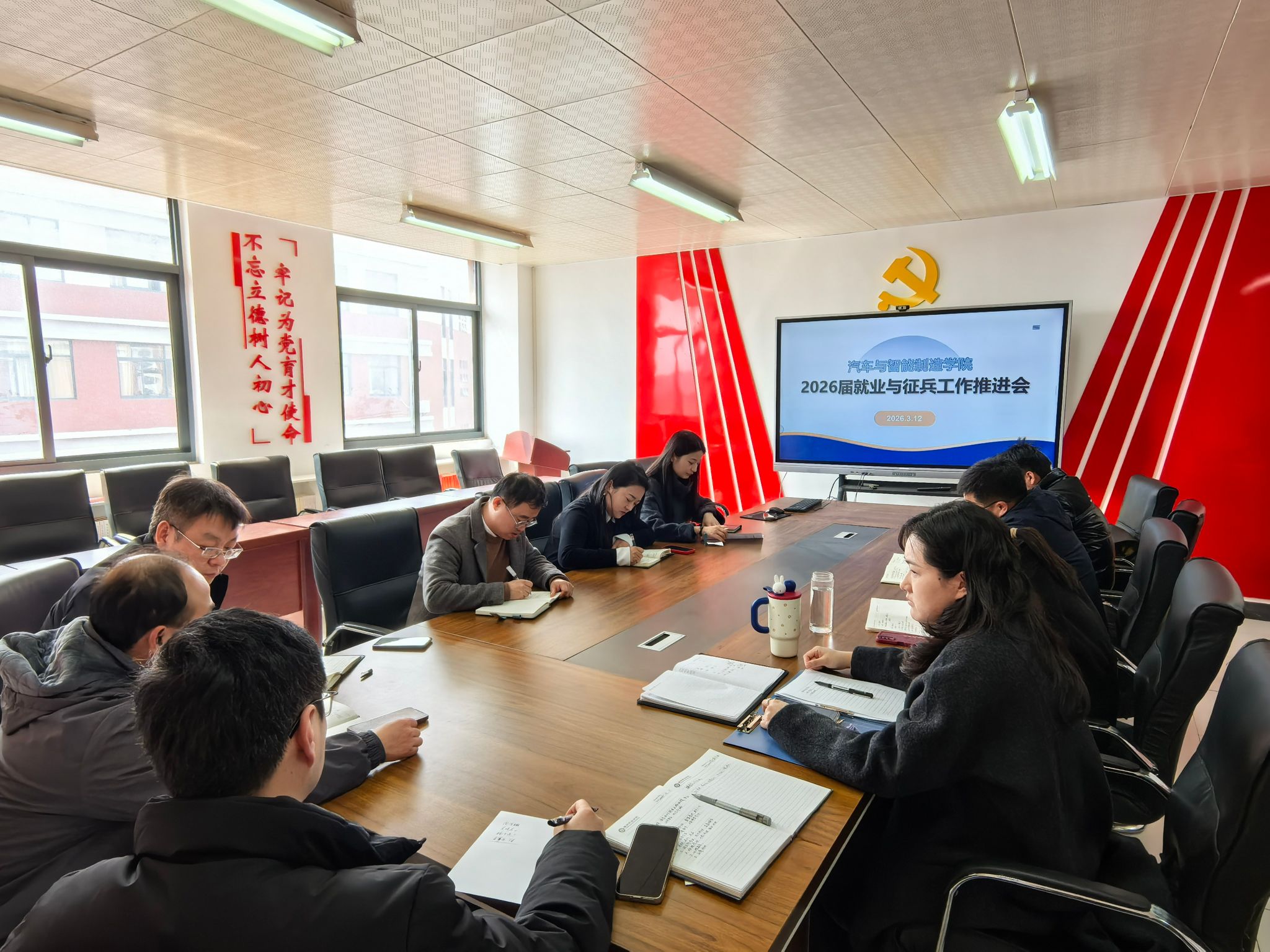 为扎实推进2026届毕业生就业工作,深入做好大学生征兵宣传动员工作,切实压实工作责任、明确工作方向,3月12日下午,汽车与智能制造学院召开2026届毕业生就业与征兵工作推进会。会议全面分析当前就业形势,系统部署下一阶段就业与征兵重点工作任务。学院党总支书记靳春生、副院长贾屿、全体辅导员参加会议,学校招生就业办公室主任惠光伦应邀出席会议。